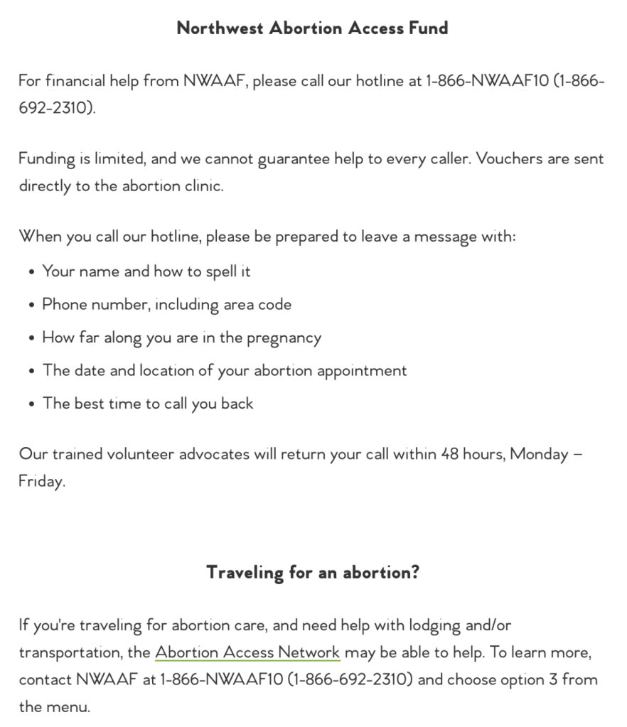 If a person does not have insurance and does not qualify for Apple Health (Medicaid) they can utilize financial support from the Northwest Abortion Access Fund.