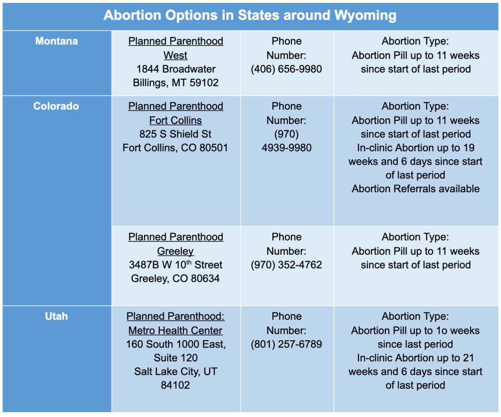 - The strongest resource available for abortion funding in Wyoming is Chelsea’s Fund: https://www.chelseasfund.org/